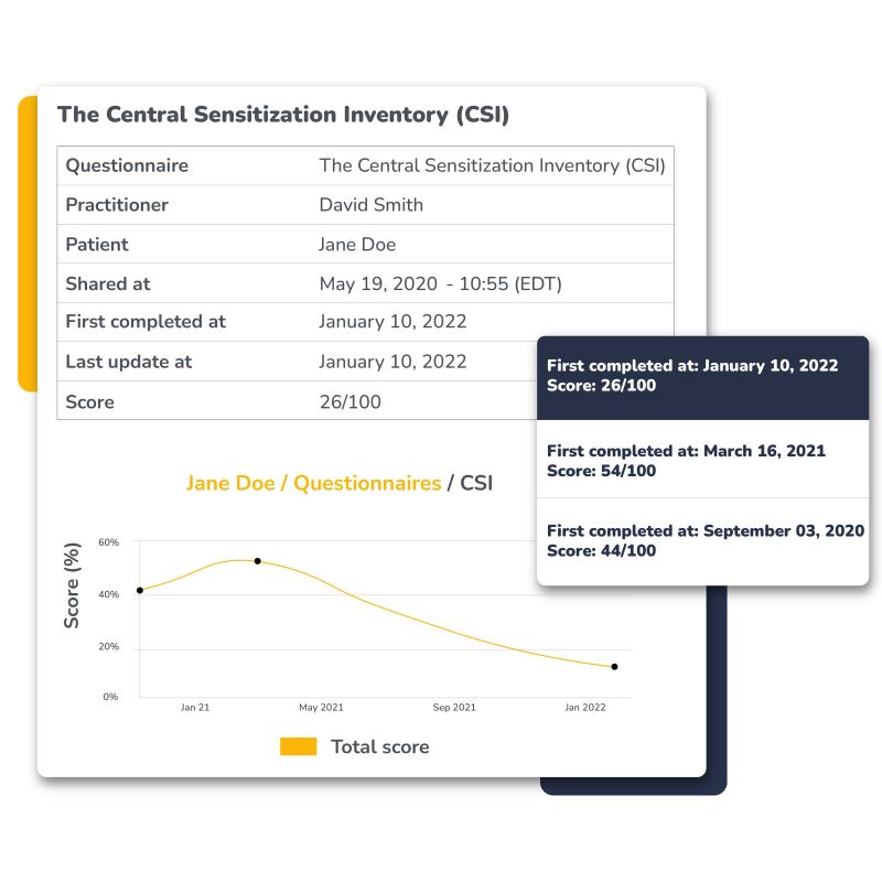 Create and customize questionnaires including intake forms, satisfaction surveys, and standardized outcome measures. Select from a wide range of templates available including the DASS, CSI, FABQ, and Pelvic Health Symptom Monitor, or create your own! Use our automated scoring to view change over time on elegant dashboards.